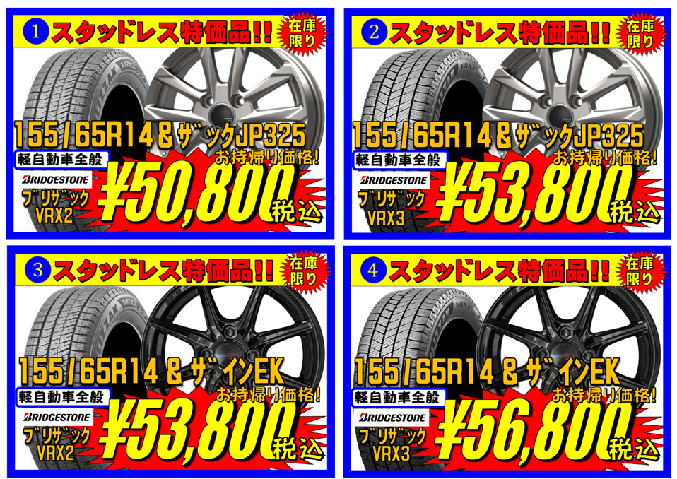 下記の価格は、タイヤ4本・組み換え工賃・バランス調整・脱着工賃