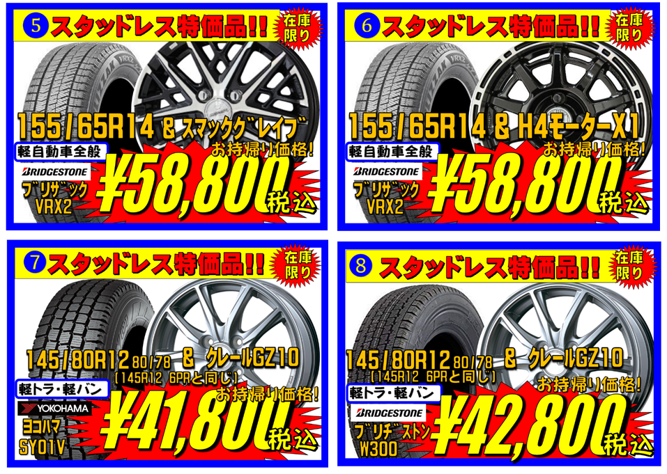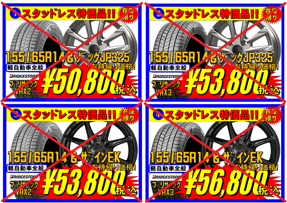 下記の価格は、タイヤ4本・組み換え工賃・バランス調整・脱着工賃